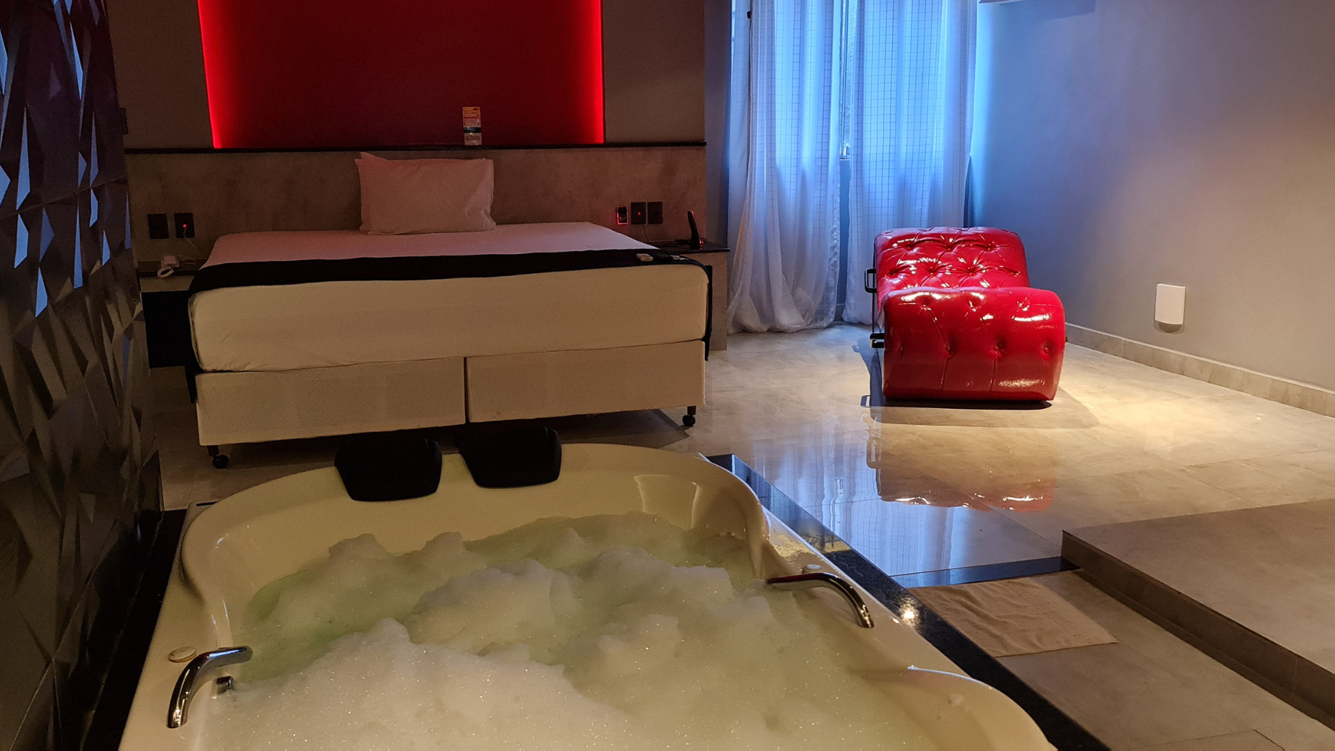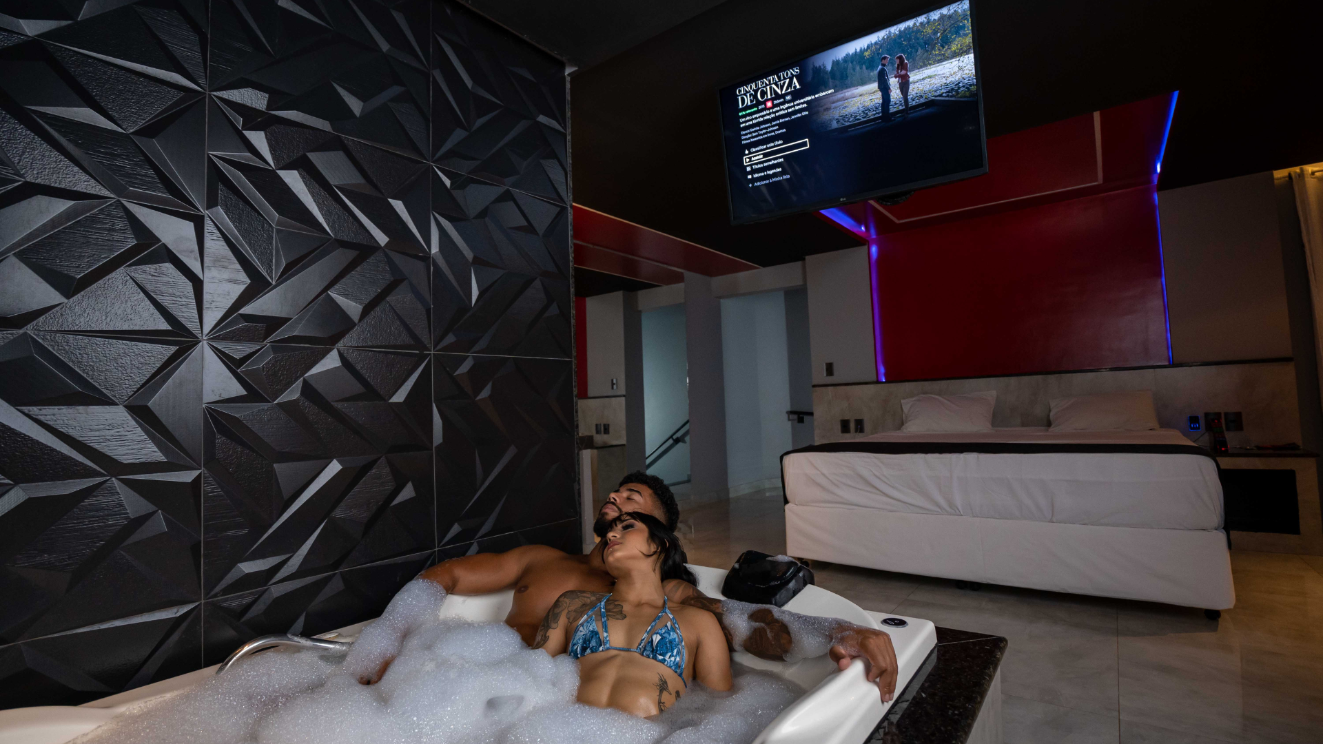 A banheira de hidromassagem acrescenta o toque de relaxamento que completa a experiência. É o momento de desacelerar, de deixar a água morna e a música preencherem o ambiente e de se reconectar de forma leve e intensa. Com o sistema de som Bluetooth, é possível escolher a trilha sonora ideal para o momento, enquanto a TV com acesso à Netflix e canal erótico amplia as possibilidades de prazer e descontração.