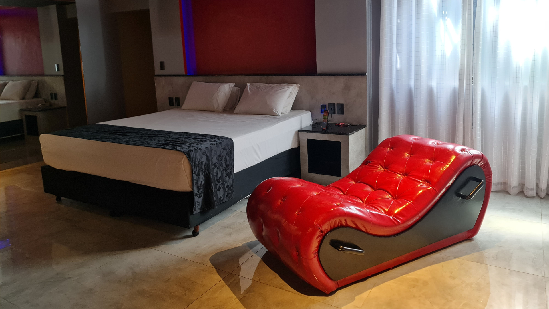 Logo ao entrar, é impossível não notar o cenário: a poltrona erótica de design exclusivo e os acessórios na parede, discretamente posicionados, convidam à imaginação e à entrega. Tudo foi planejado para que o casal possa se permitir explorar novas sensações, em um ambiente seguro, confortável e esteticamente impecável.