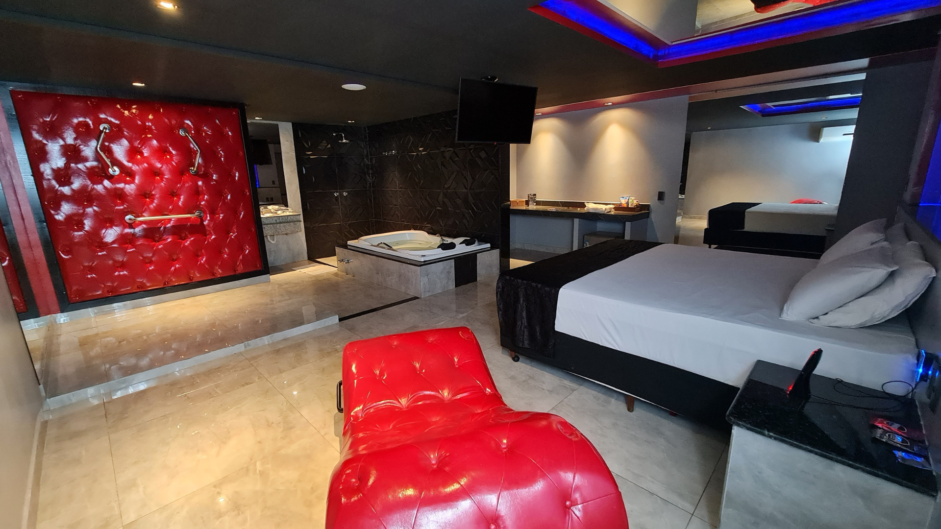 A Suíte Gran Prime é o ponto onde o luxo encontra o prazer um espaço desenhado para quem quer viver o desejo de forma intensa, mas com elegância. Cada detalhe foi pensado para despertar os sentidos: a iluminação especial em tons de vermelho e azul, o couro que reveste as paredes, o aroma suave no ar e o design provocante que transforma o ambiente em uma experiência completa.
